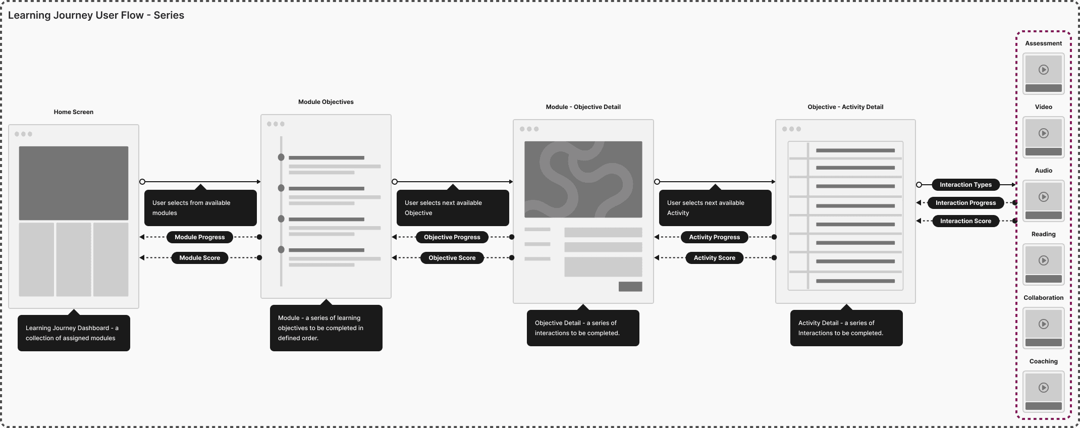 A key element of the UX & Product team was to synthesize the artifacts from each work stream into a consistent structure behind the content — what we came to refer to as the platform’s atomic system. We were no longer building isolated programs or standalone sessions; we were building a system. That meant identifying the foundational objects that would power all learning experiences going forward.