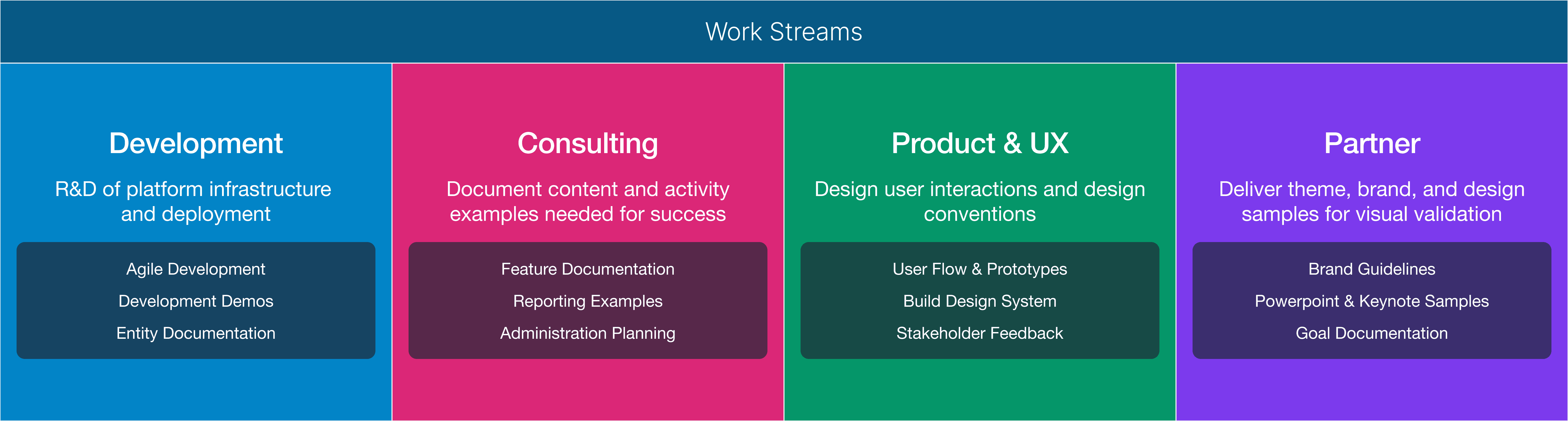Based on these objectives, we organized work streams into parallel work based on stakeholder responsibility.