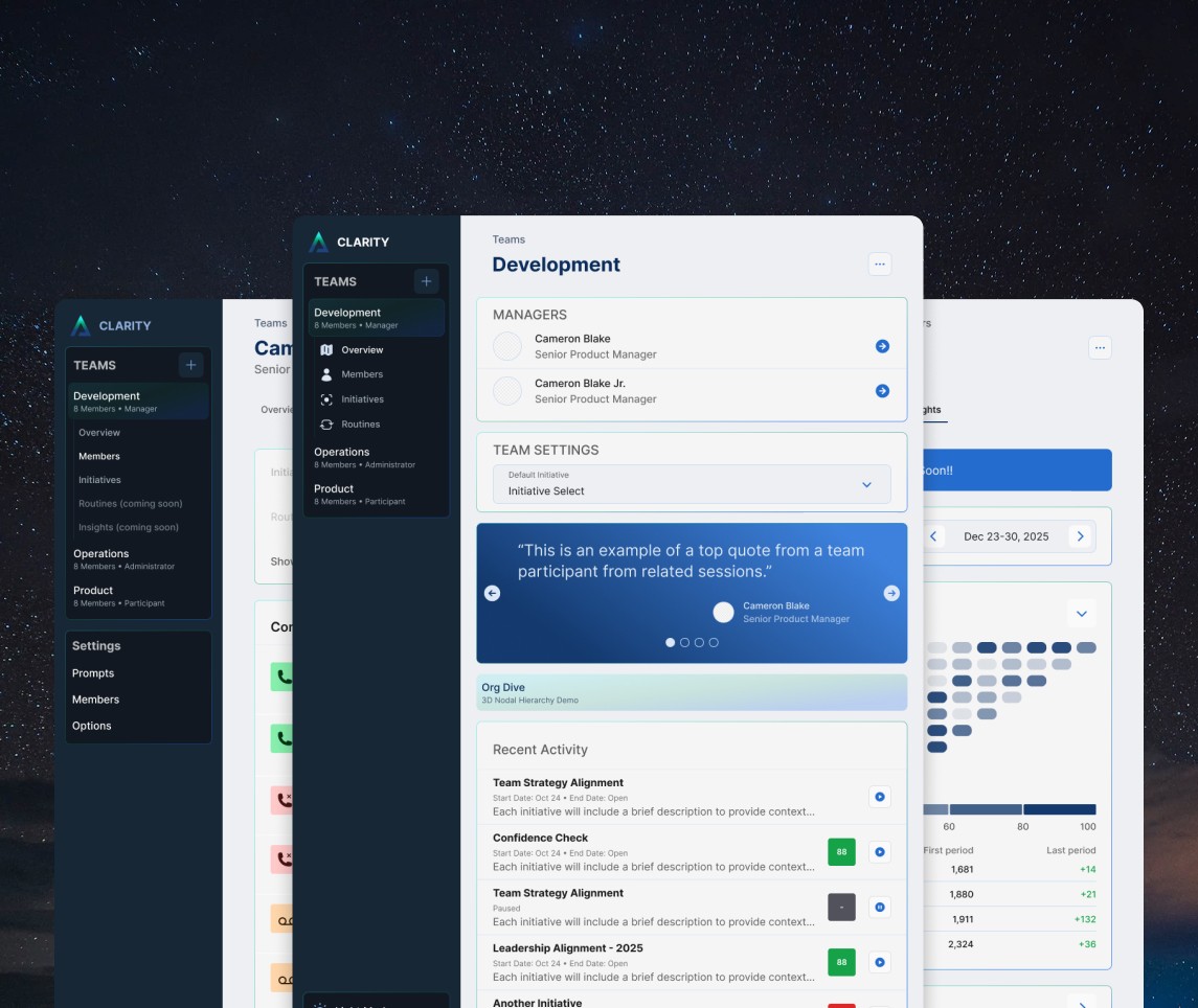 Clarity introduces a new model: ambient voice check-ins powered by AI. Employees speak freely — sharing what’s going well, what’s unclear, or what’s getting in the way. The system transcribes, analyzes, and synthesizes responses into visual summaries and trend insights. Leaders gain a clearer picture of their teams — not just tasks, but tone.